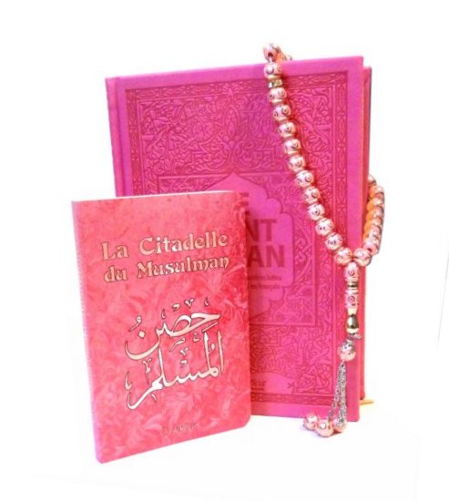 Pack cadeau rose pour femme : Le Saint Coran (français/arabe/phonétique) + La Citadelle du Musulman et Chapelet "Sebha" de luxe assortis Livre