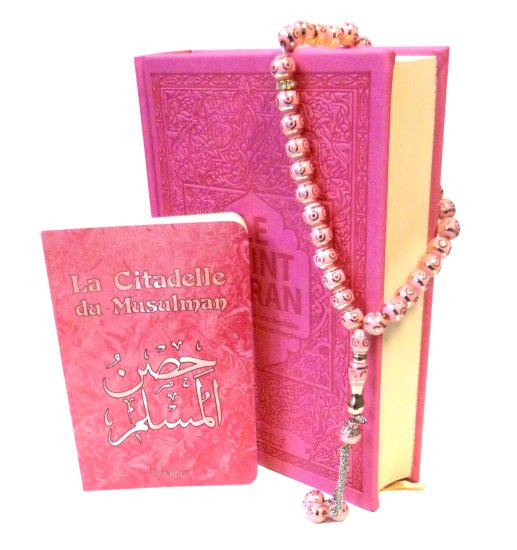 Pack cadeau rose pour femme : Le Saint Coran (francais/arabe/phonetique) + La Citadelle du Musulman et Chapelet "Sebha" de luxe assortis