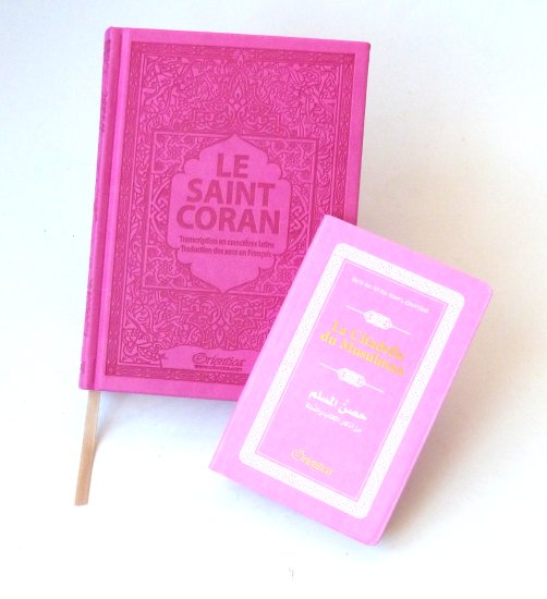 Pack cadeau rose pour femmes : Le Saint Coran couverture cuir de luxe + La Citadelle du Musulman (tous deux en francais-arabe-phonetique)