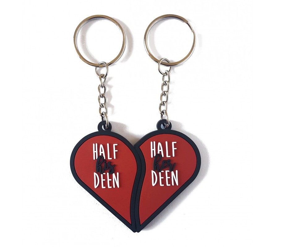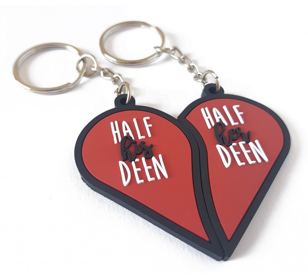 Pack de 2 Porte-cles plastiques souples "Half his Deen" (La moitie de sa religion) pour couple -