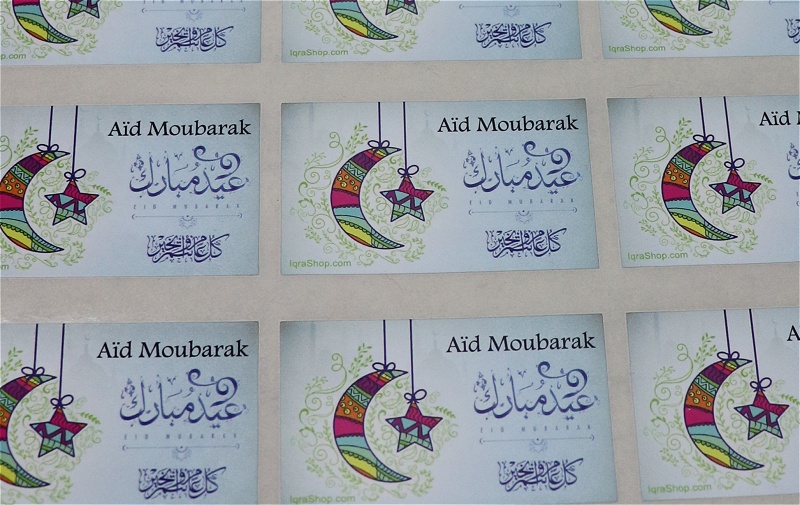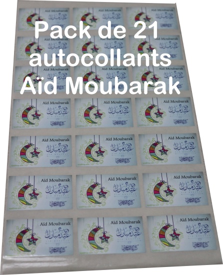 Pack de 21 autocollants "Aid Moubarak" bilingues (français/arabe - 6 cm) pour cadeaux musulman - Stickers Eid Mubarak - عيد مبارك - REF. 28666 (1.90 €) - En Promotion à 1.30 €