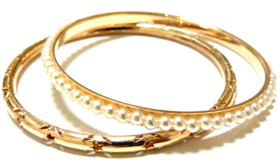 Ensemble constitué de 2 bracelet en métal doré garni d'une bande de perles ovales de couleur blanche 1 étoilé.