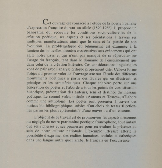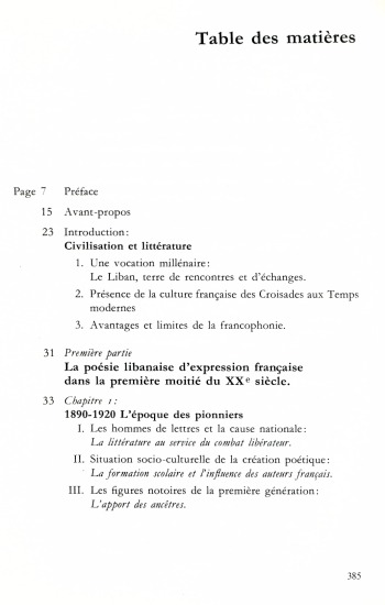 Le présent travail est consacré à l'étude de la poésie libanaise d'expression française durant un siècle (1890-1995). Notre dessein est d'établir un panorama qui recouvre les conditions socio-culturelles de la création poétique, ses aspects et ses orientations à travers ses multiples manifestations ainsi que le sens et la portée de son évolution. Certes, le sujet a déjà suscité l'attention des amateurs éclairés et fait l'objet de quelques études, mais l'intérêt se limitait, dans la plupart des cas, à des courants ou à des thèmes, les essais exhaustifs, disponibles aujourd'hui, restent rares par rapport à l'importance du champ d'étude.
