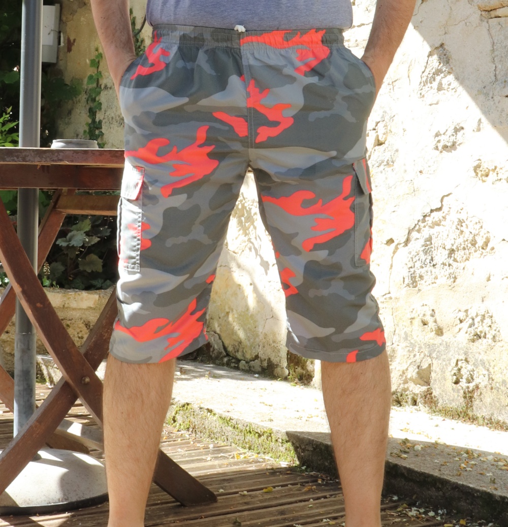 Ce tissus sèche très rapidement. Taille élastique avec cordon de serrage. Quatre (4) poches dont deux à fermeture scratch.
