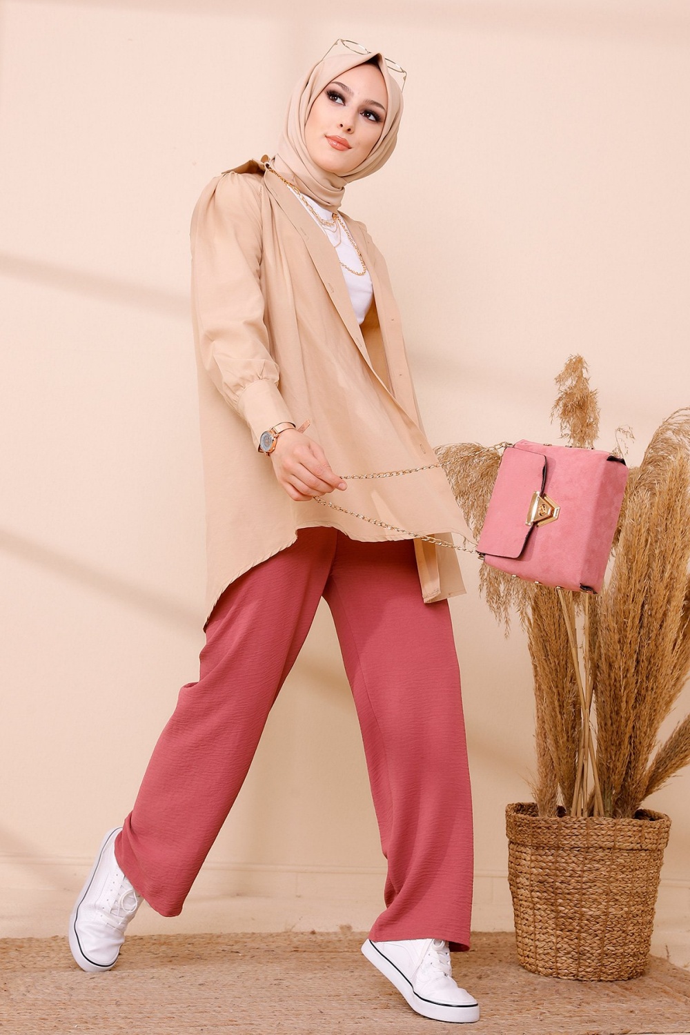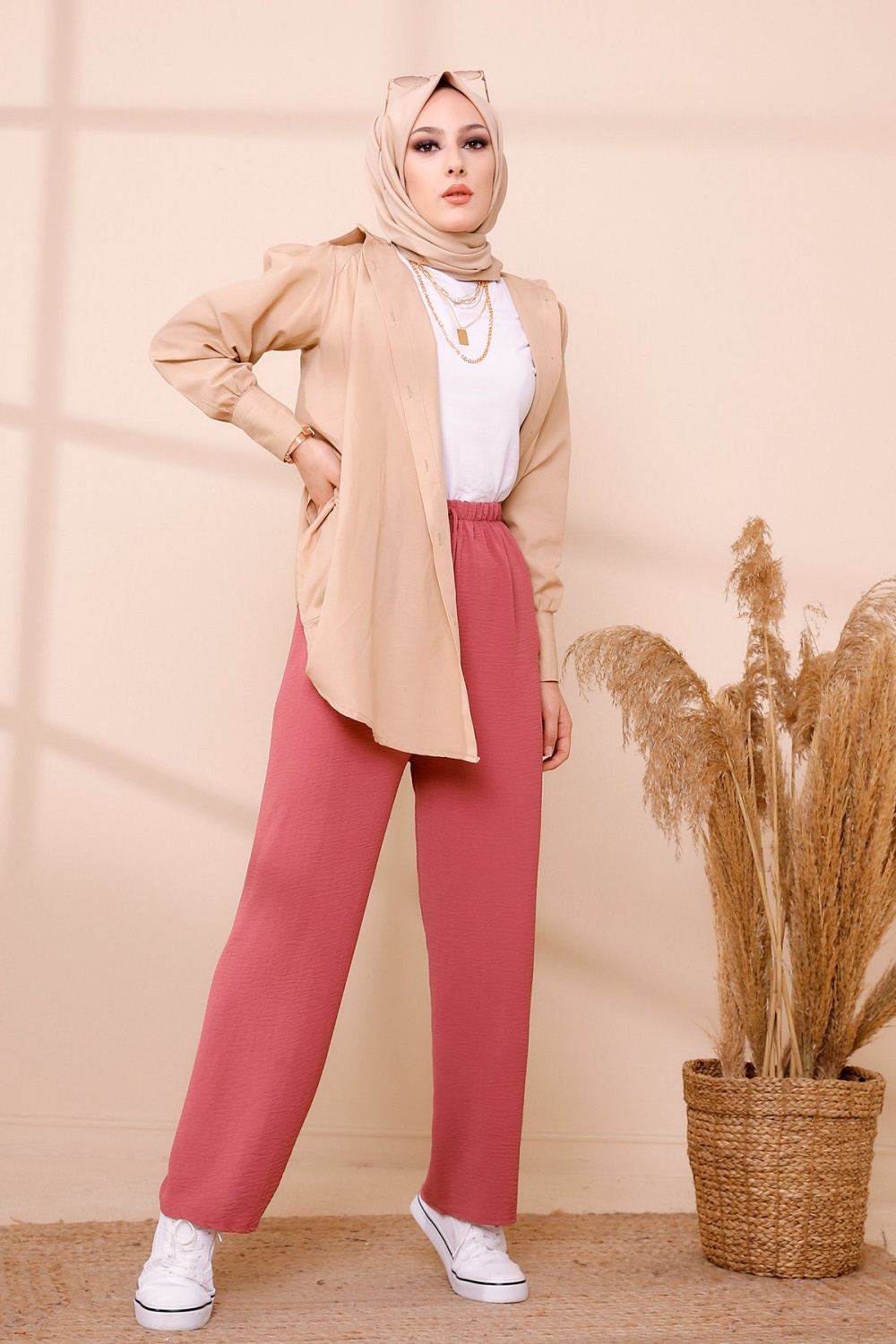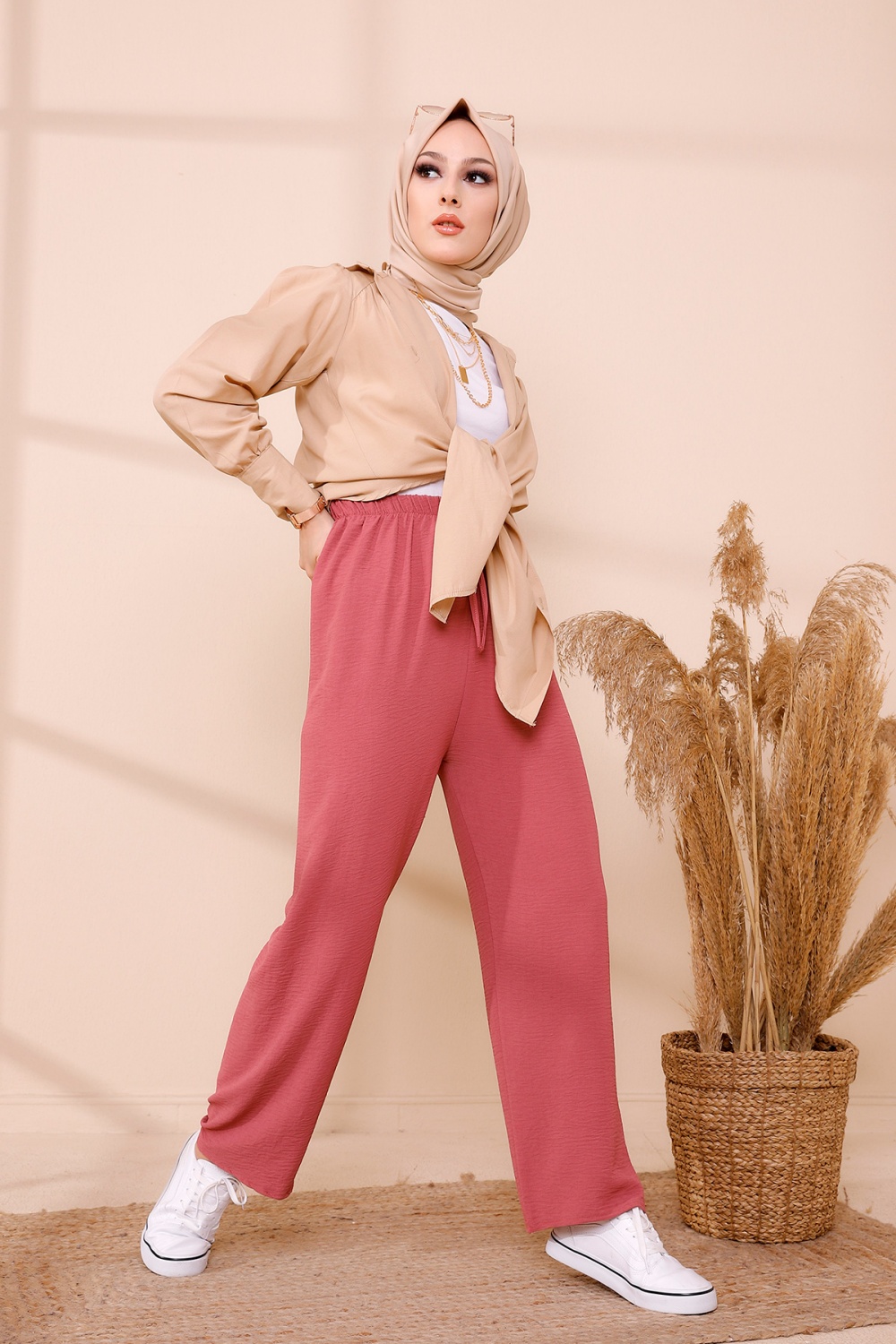 Ensemble casual : Palazzo ample et Blouse avec collier assorti pour femme (Ensembles Hijab Turque) - Couleur crème et Bordeaux - REF. 32867 (19.90 €)