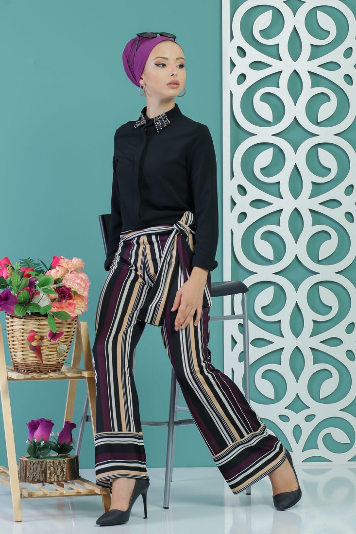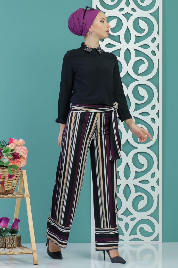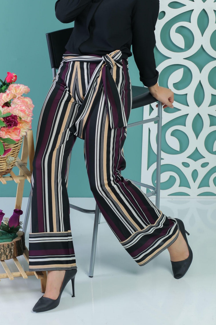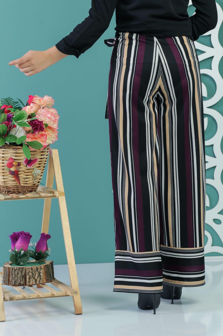Pantalon femme a rayures noires, beiges et violettes - Marque Amelis Paris