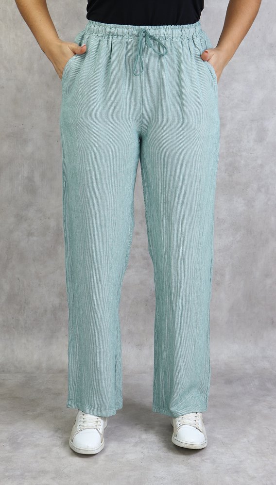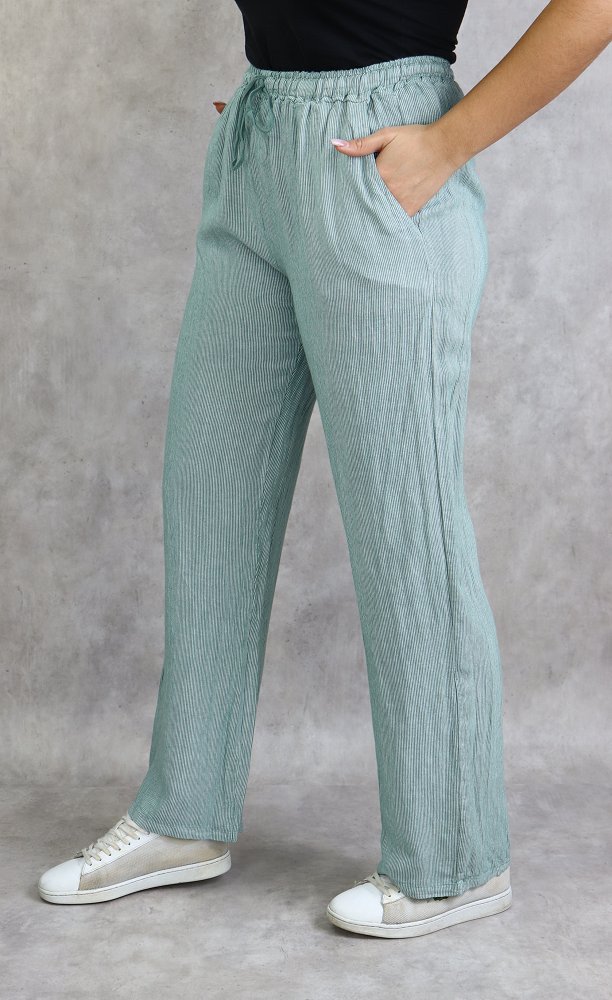 Pantalon femme décontracté en lin blanc à fines rayures vert amande Vetement & Accessoire