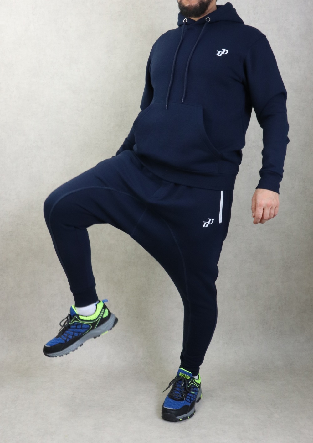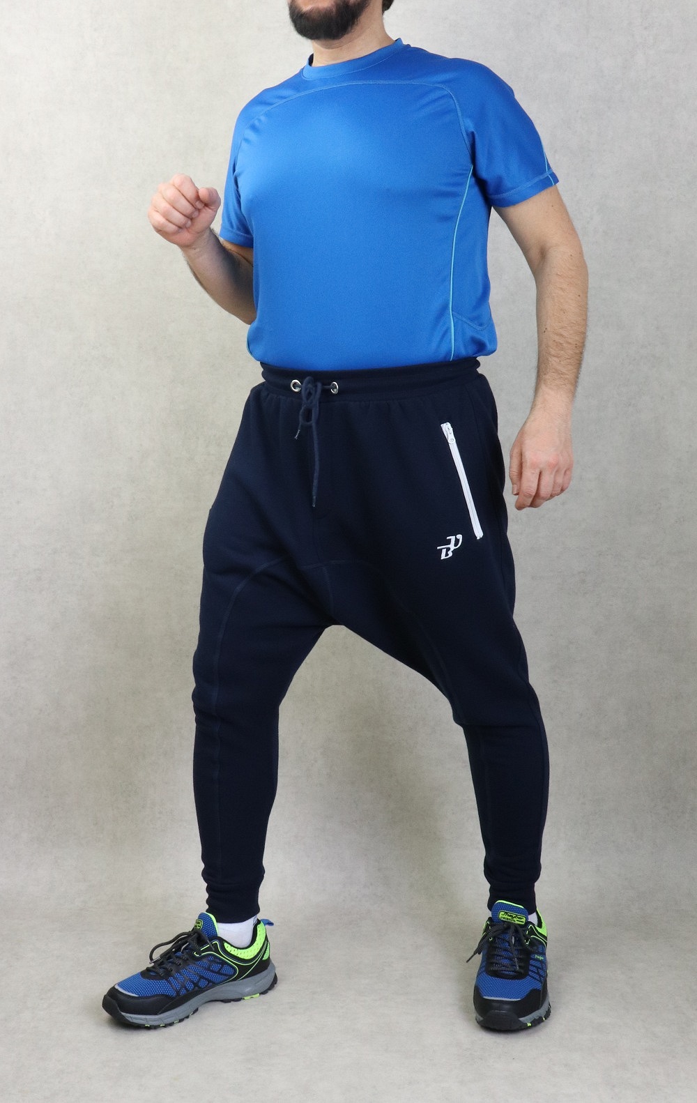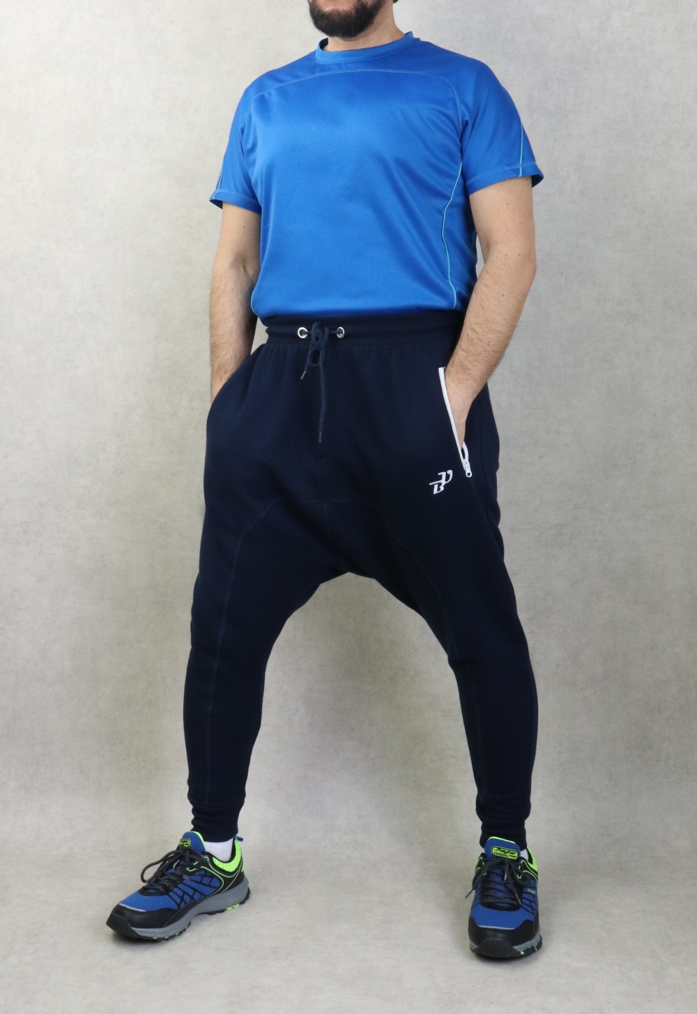 Sarouel large et long couleur bleu marine. Tissu molletonné coton très doux. Deux poches zippées latérales de couleur blanches et une poche arrière. Braguette zippe. Taille élastique avec cordon de serrage. Chevilles élastiques. Brodé logo BU (Best Ummah).