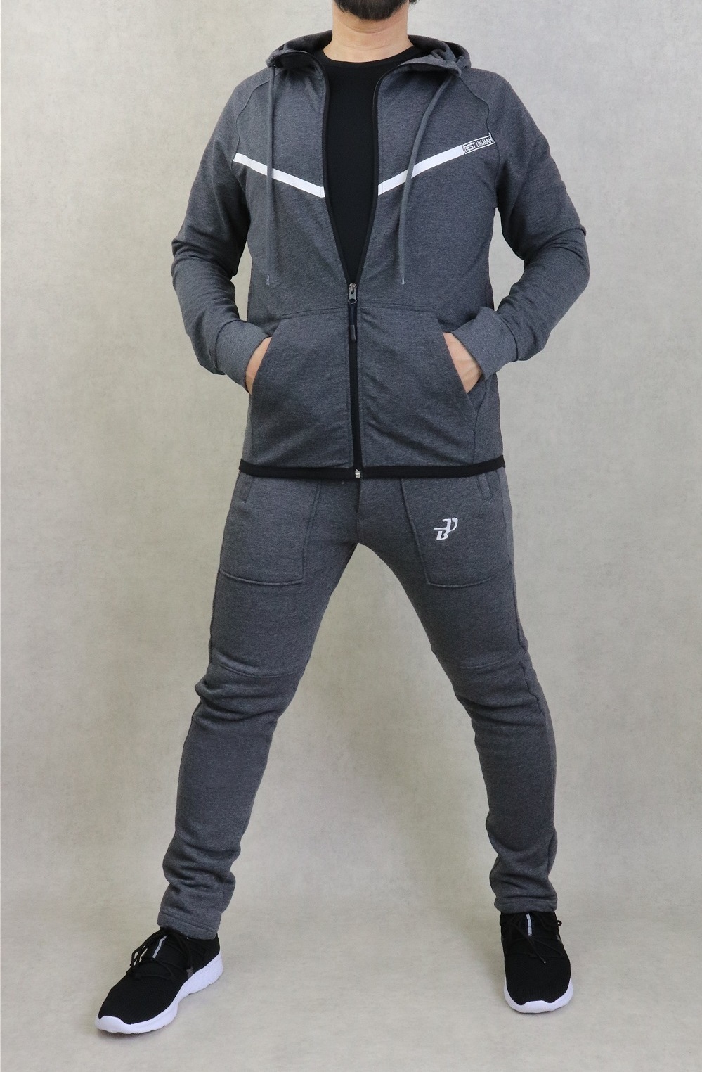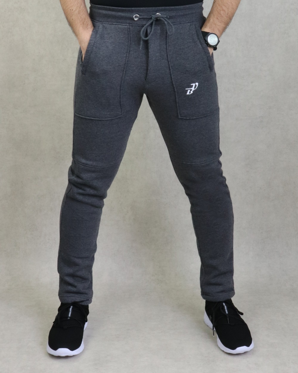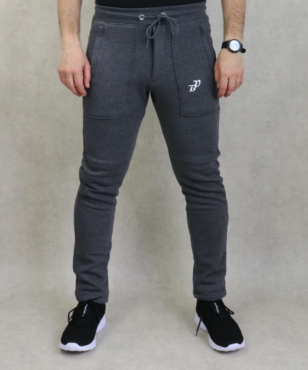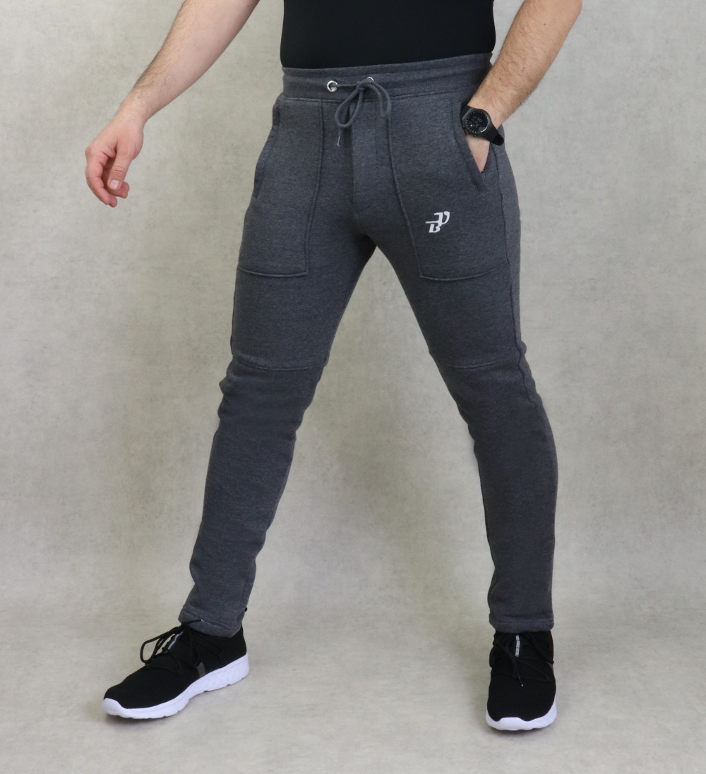 Pantalon gris foncé chiné. Tissu léger et très doux. Deux grandes poches zippées latérales et une poche arrière. Taille élastique avec cordon de serrage. Braguette zip. Brodé logo BU (Best Ummah).
