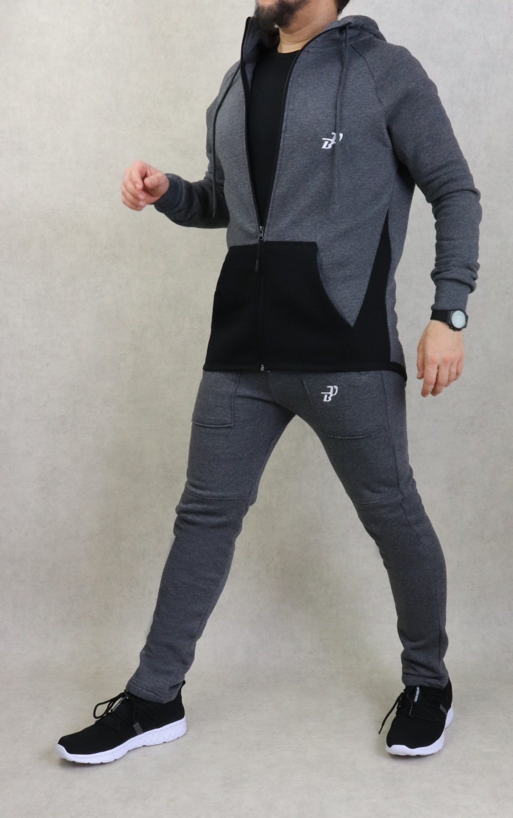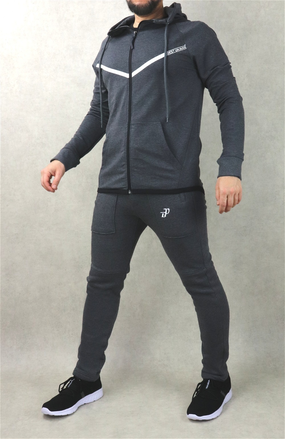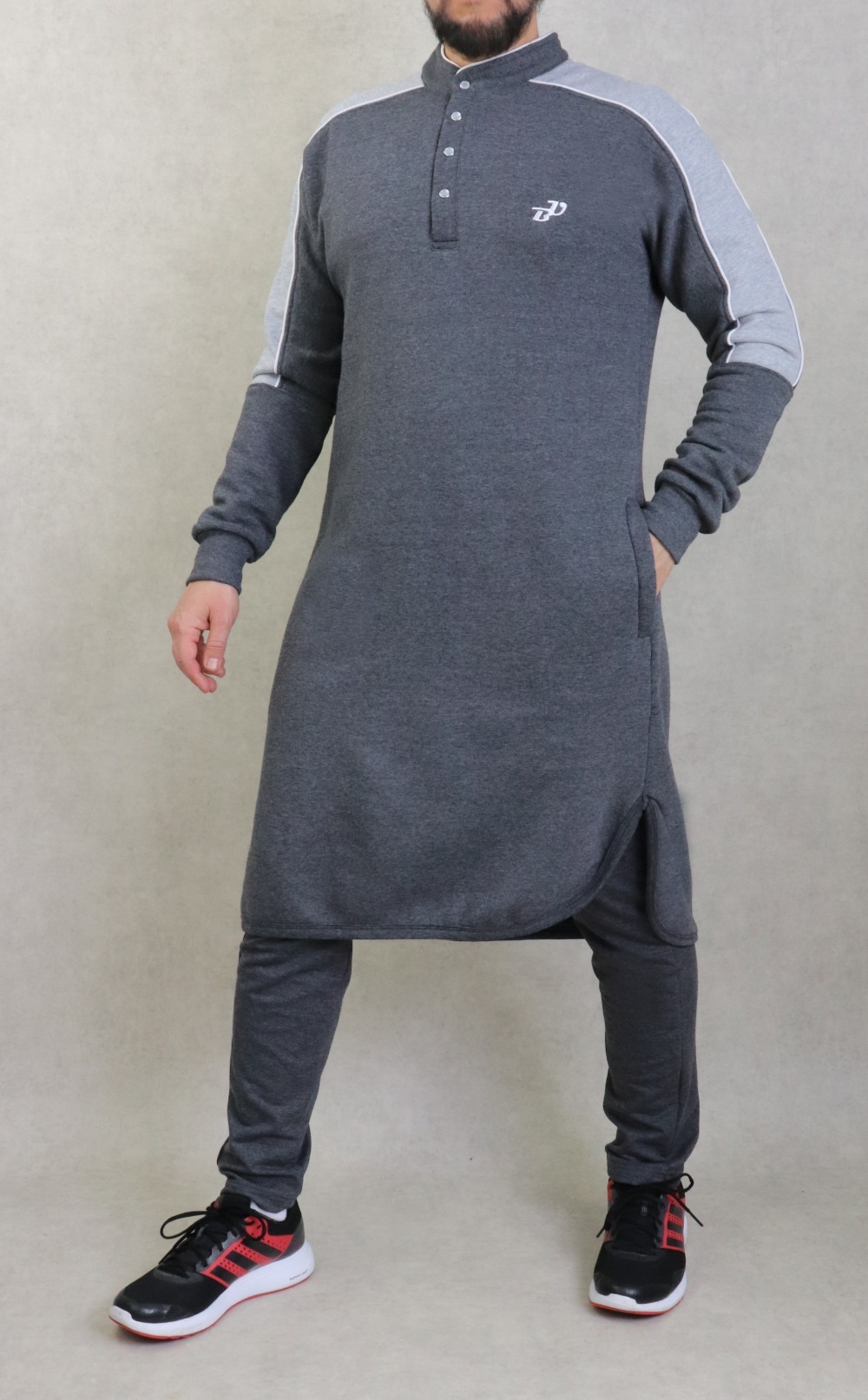 Pantalon gris foncé chiné. Tissu léger et très doux. Deux grandes poches zippées latérales et une poche arrière. Taille élastique avec cordon de serrage. Braguette zip. Brodé logo BU (Best Ummah).