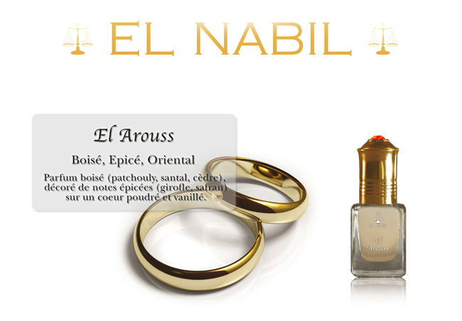 Parfum El Nabil "Al Arouss" : Boisé, epicé, oriental : parfum boisé, décoré de notes épicées sur un coeur poudré et vanillé.