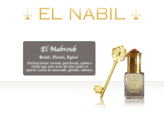 Parfum El Nabil "El Mabrouk" : Boisé, fleuri, epicé : parfum boisé, vivifié par une note de tête rosée et épicée.