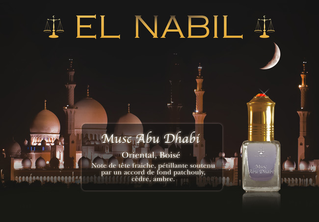 Parfum El Nabil "Musc Abu Dhabi" : Oriental, boisé... Note de tête fraiche, pétillante soutenu par un accord de fond patchouli, cèdre, ambre.