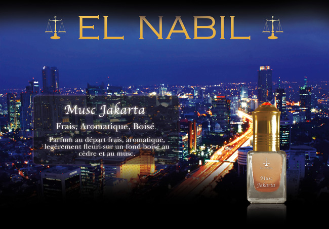 Parfum El Nabil "Musc Jakarta" : Frais, Aromatique, Boisé... Parfum au départ frais, aromatique, légèrement fleuri sur un fond boisé au cèdre et au musc.