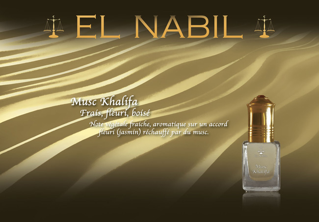 Parfum El Nabil "Musc Khalifa" : Frais, fleuri, boisé...Note végétale fraiche, aromatique sur un accord fleuri (jasmin) réchauffé par du musc.