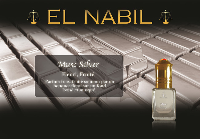 Parfum El Nabil "Musc Silver" : Fleuri, fruité... Parfum frais, fruité, soutenu par un bouquet floral sur un fond boisé et musqué.