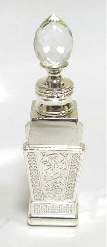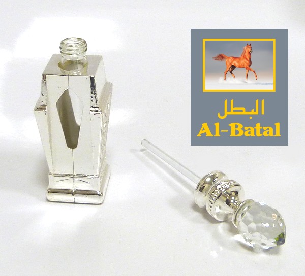 Parfum Musc d'Or "Al-Batal" (Le héros) pour hommes. Bouteille métallique argentée. Bouchon sculpté en diamant, avec tige en verre.