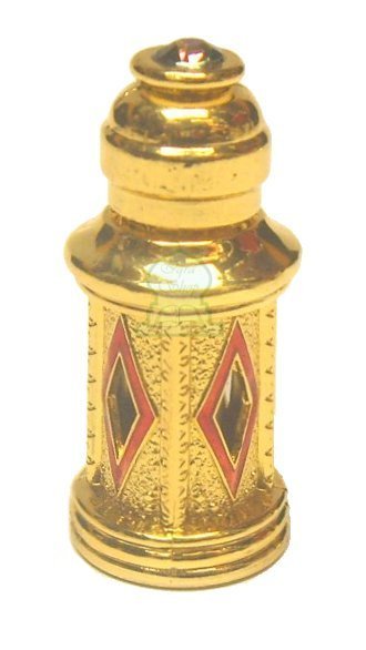 Parfum concentré "Rose" (mixte) dans un très beau flacon métallique doré aux losanges rouges permettant de voir le niveau du parfum. Bouchon tige avec diamant.