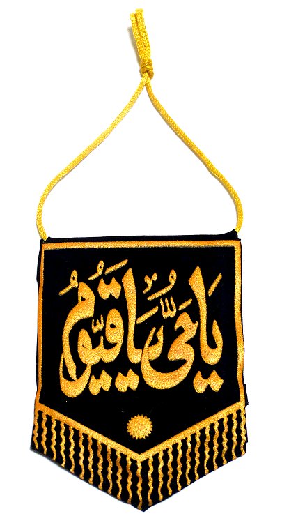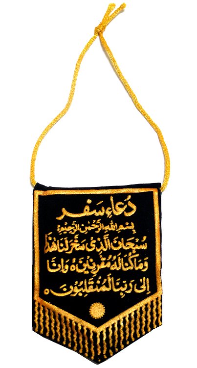 Pendentif recouvert de velours noir avec écritures dorées, sur une face l'invocation du voyage et sur l'autre l'invocation coranique "Yâ Hayyou Yâ Qayyoum".