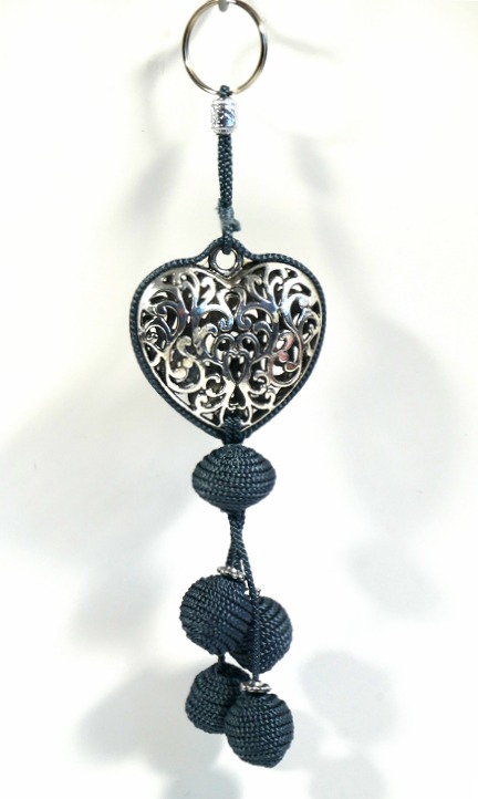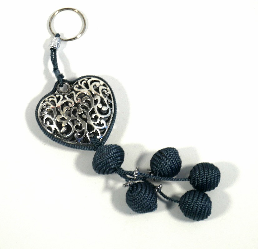 Pendentif / Porte-cles artisanal coeur en metal argente cisele et pompon en sabra - Gris