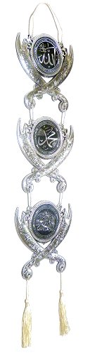 Décoration islamique argentée constituée de trois parties (calligraphies) et se termine par deux pompons.
