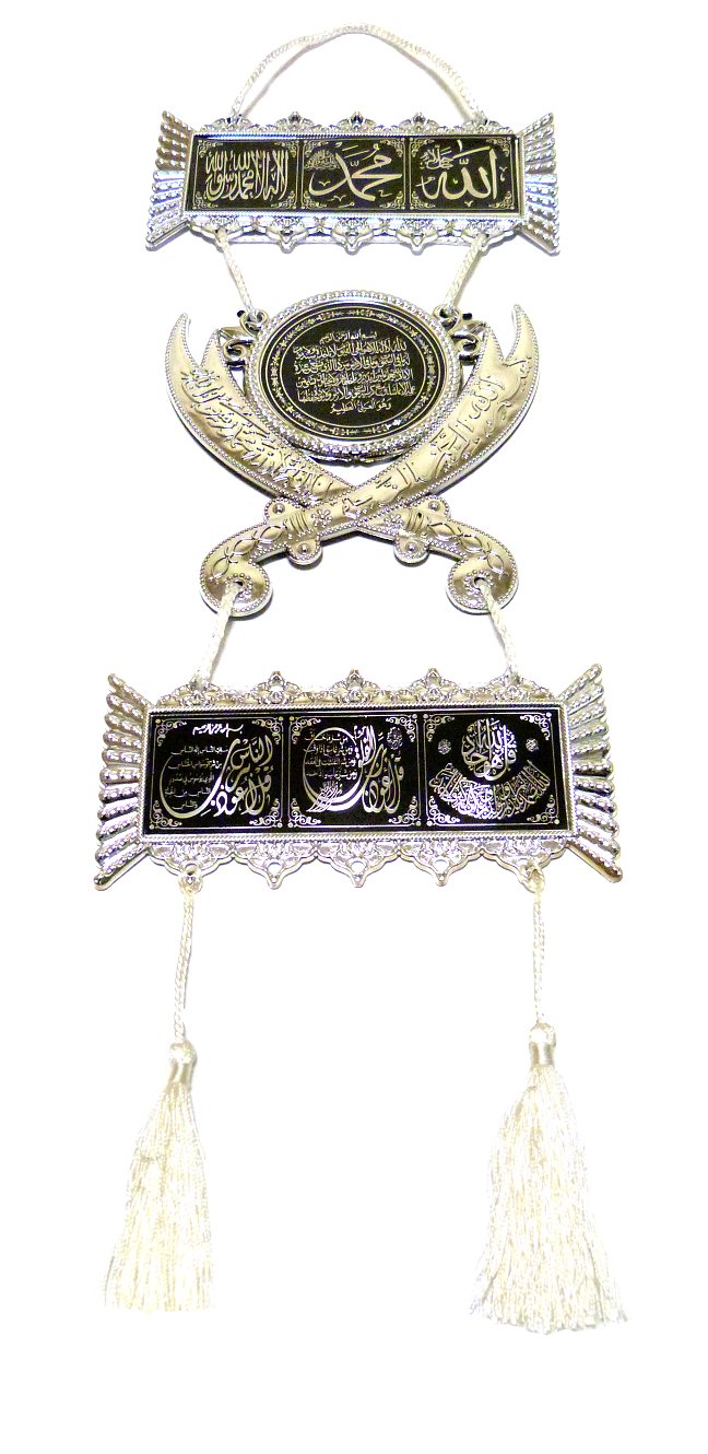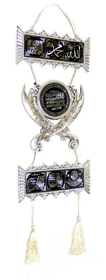 Décoration islamique toute argentée avec les calligraphie des Noms Allah (Jalla Jalâlouh), Muhammad (SAW), l'attestation de foi, au milieu le verset du Trône (Ayatoulkoursî) et en bas les trois sourates protectrices (qui commencent par "qoul").