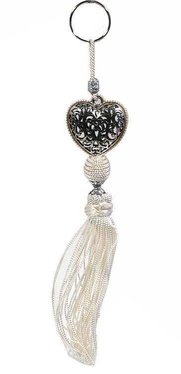 Pendentif / Porte-clés artisanal coeur en métal argenté ciselé et pompon en sabra - Blanc - REF. 29098 (6.90 €)