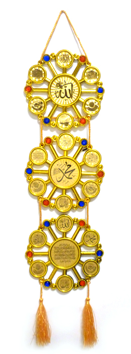 Pendentif (fanion) décoratif doré Composées de trois pièces dorées avec le nom de Allah, de son messager et Âyatu l-Kursî, et chacun des trois cercles est entouré de plusieurs petits cercles contenant : un de ces trois écrits ou le début de Sûrat Yâcîne, ou une des trois sourates suivantes : Al Falaq, An-Nâs, ou Al Ikhlâs.