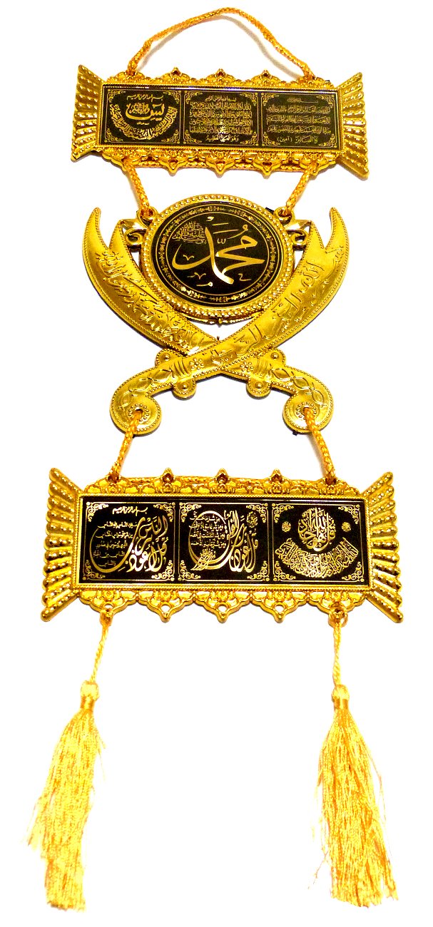 Pendentif islamique décoratif doré le verset du Trône (Ayatu l-Kursî) et le nom du prophète Muhammad et l'attestation de foi (chahada) - REF. 23883 (4.50 €)