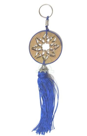 Pendentif porte-cles en bois de forme ronde sculpte d'arabesques et pompon en sabra de couleur bleue