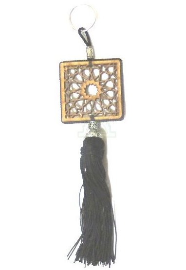 Pendentifs / porte-cles en bois de forme carree sculpte d'arabesques et pompon en sabra de couleur noire