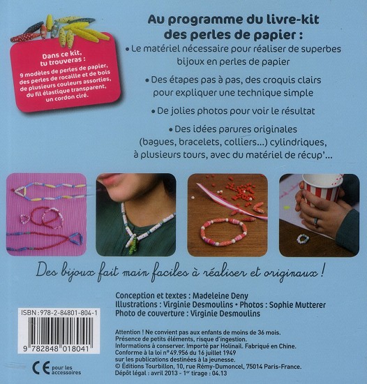 Fabrique tes bijoux... en perles de papier ! Voici 6 modèles originaux et leurs variantes, pour réaliser colliers, bagues et bracelets, dans des tonalités fraîches et tendances. Des étapes claires et illustrées expliquent leur réalisation. Un titre pour des bijoux originaux et faits main et des dizaines de motifs pour rouler ses perles !