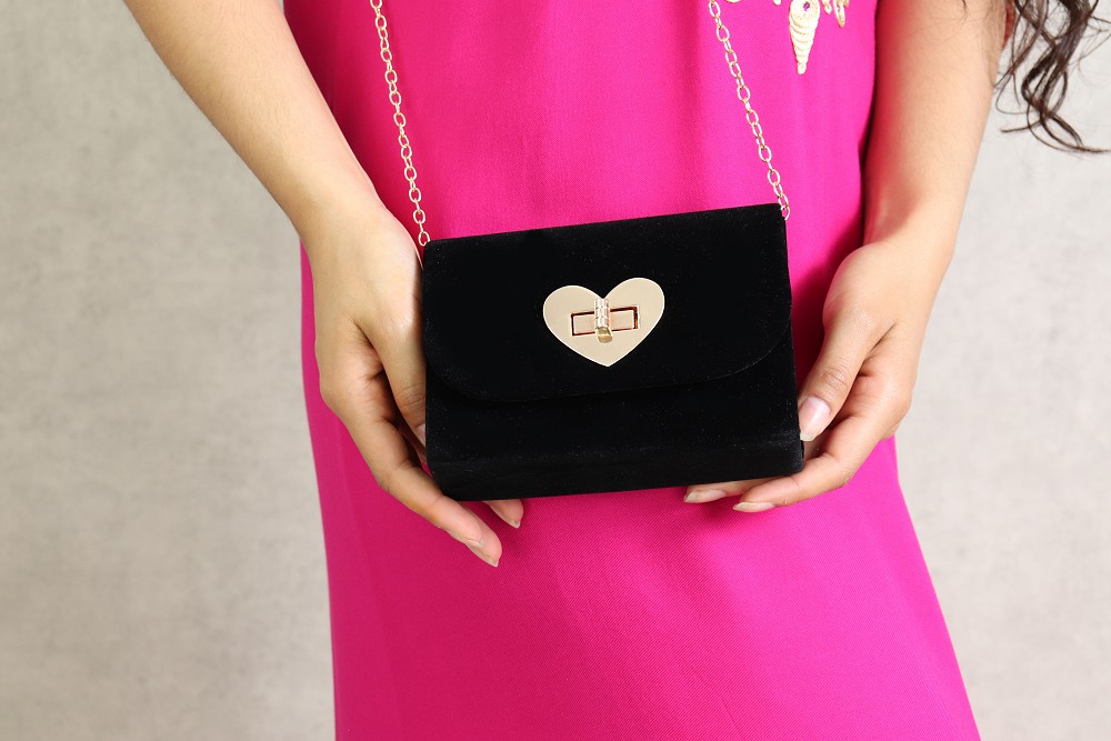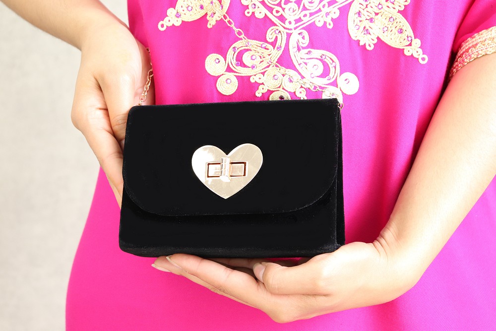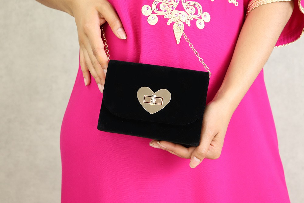 Comment ne pas craquer au vue de cette pochette de soirée effet velours. Sa petite taille est bien pratique ! Ce modèle dispose d'une bandoulière amovible à ranger l'intérieur (chaînette dorée très féminine). Fermeture incrustée dans un coeur métallique doré. Le volume intérieur est suffisamment grand (pour y ranger ses clés et son portable)...