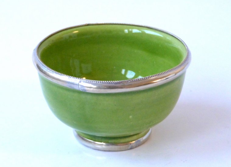 Petit bol en poterie marocain de couleur Vert emaille et cercle de metal argente
