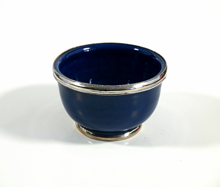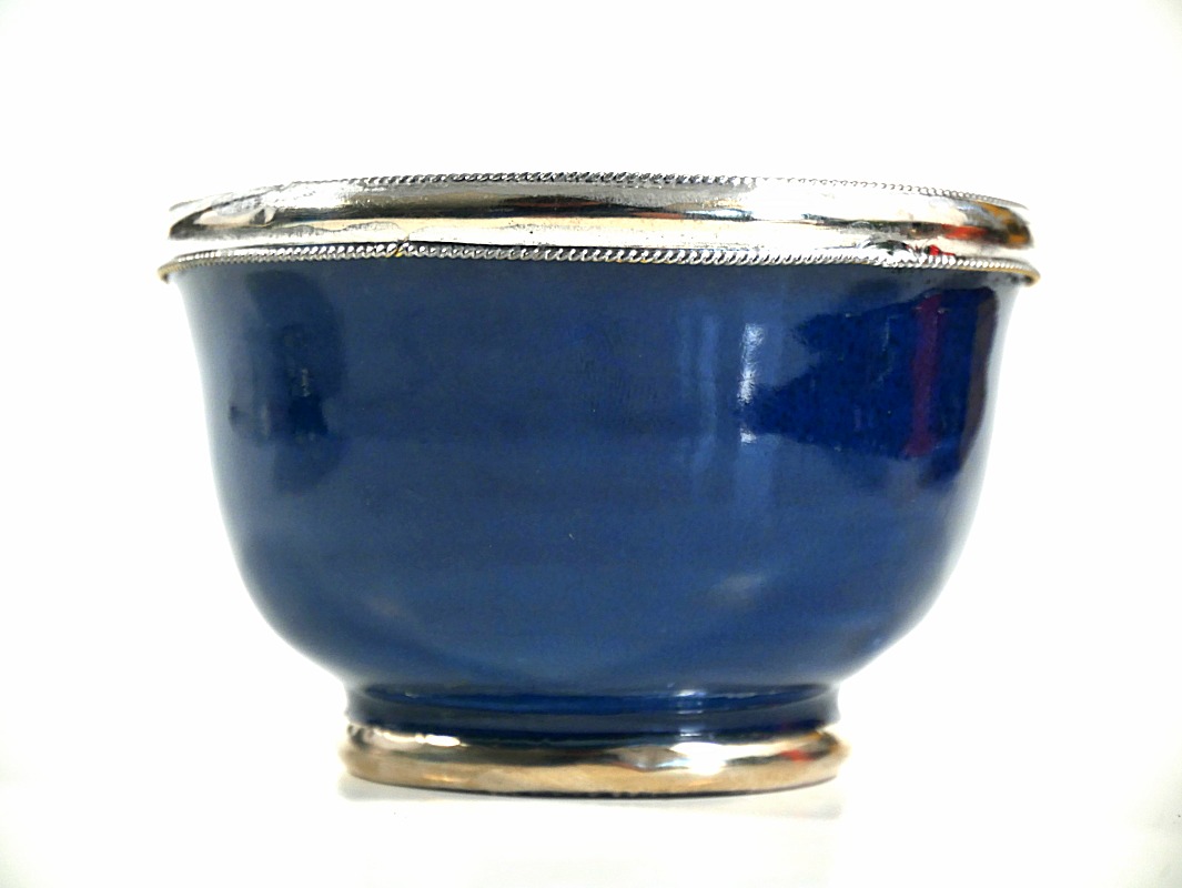 Petit bol en poterie marocain de couleur bleu petrole emaille et cercle de metal argente
