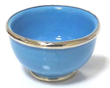 Joli récipient bleu ciel, de taille petite, en poterie, de provenance de Marrakech (Maroc), émaillé et cerclé de métal ornemental argenté légèrement ciselé.