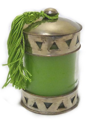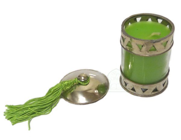 Photophore / Bougeoir en verre avec bougie cerclee de metal argente cisele termine d'un pompon en Sabra - Modele vert