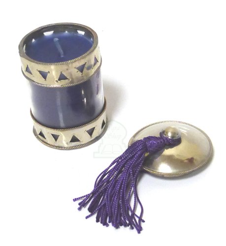 Photophore / Bougeoir en verre avec bougie cerclée de métal argenté ciselé terminé d'un pompon en Sabra - Modèle violet - REF. 16864 (9.90 €)