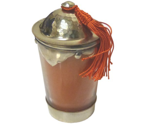 Photophore / Bougie parfumee en verre avec couvercle en metal argente cisele et martele termine d'un pompon en Sabra - Modele orange