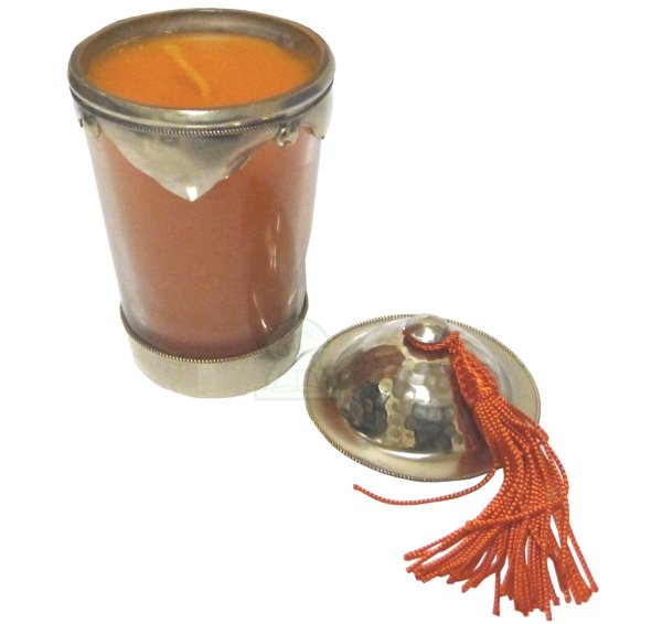 Photophore / Bougie parfumée en verre avec couvercle en métal argenté ciselé et martelé terminé d'un pompon en Sabra - Modèle orange - REF. 16643 (12.00 €)