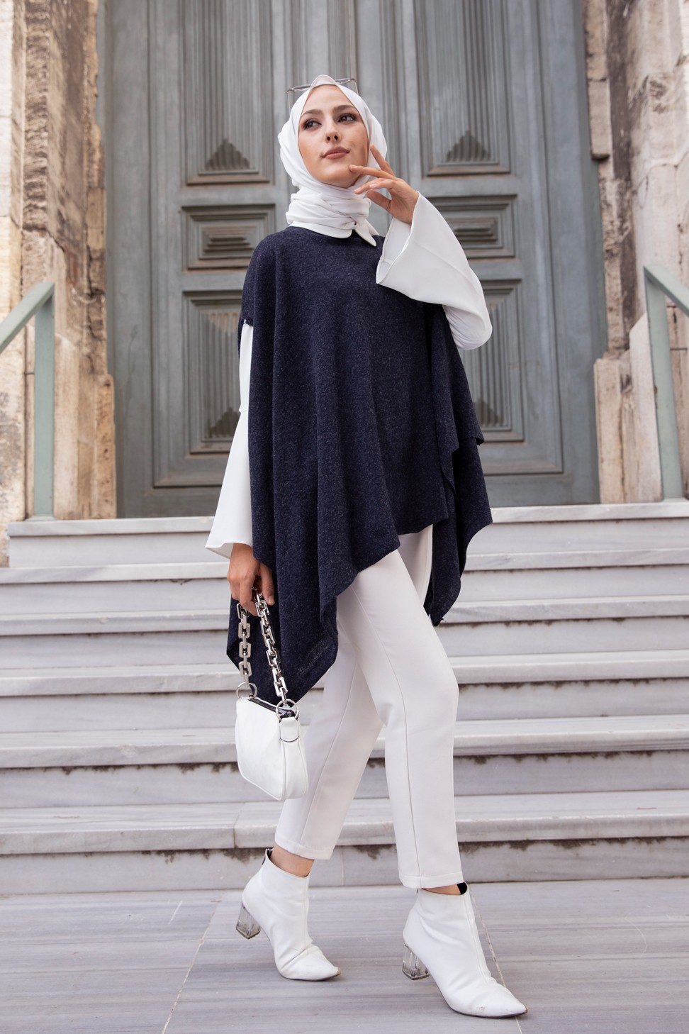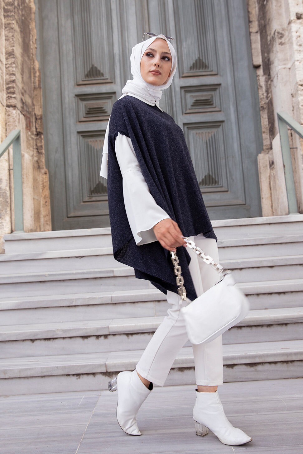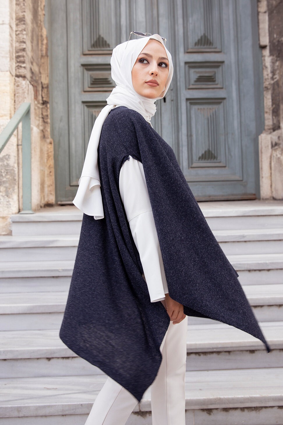 Gilet décontracté à capuche (Vetement moderne pour femme voilée) - Couleur blanc et indigo - REF. 32798 (27.00 €) - En Promotion à 19.90 €