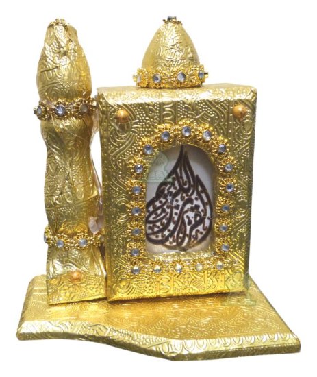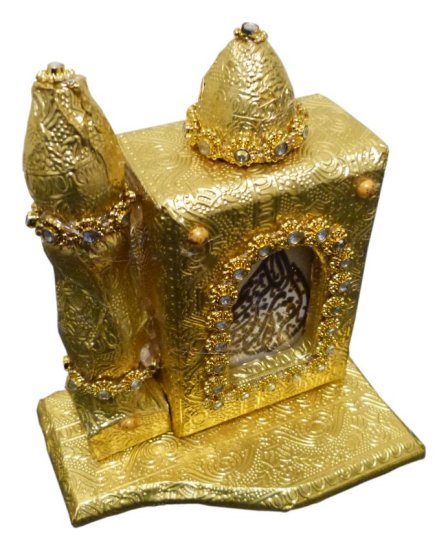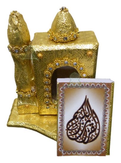 Porte Coran (fourreau) dore sous forme de mosquee avec decorations et son Coran assorti