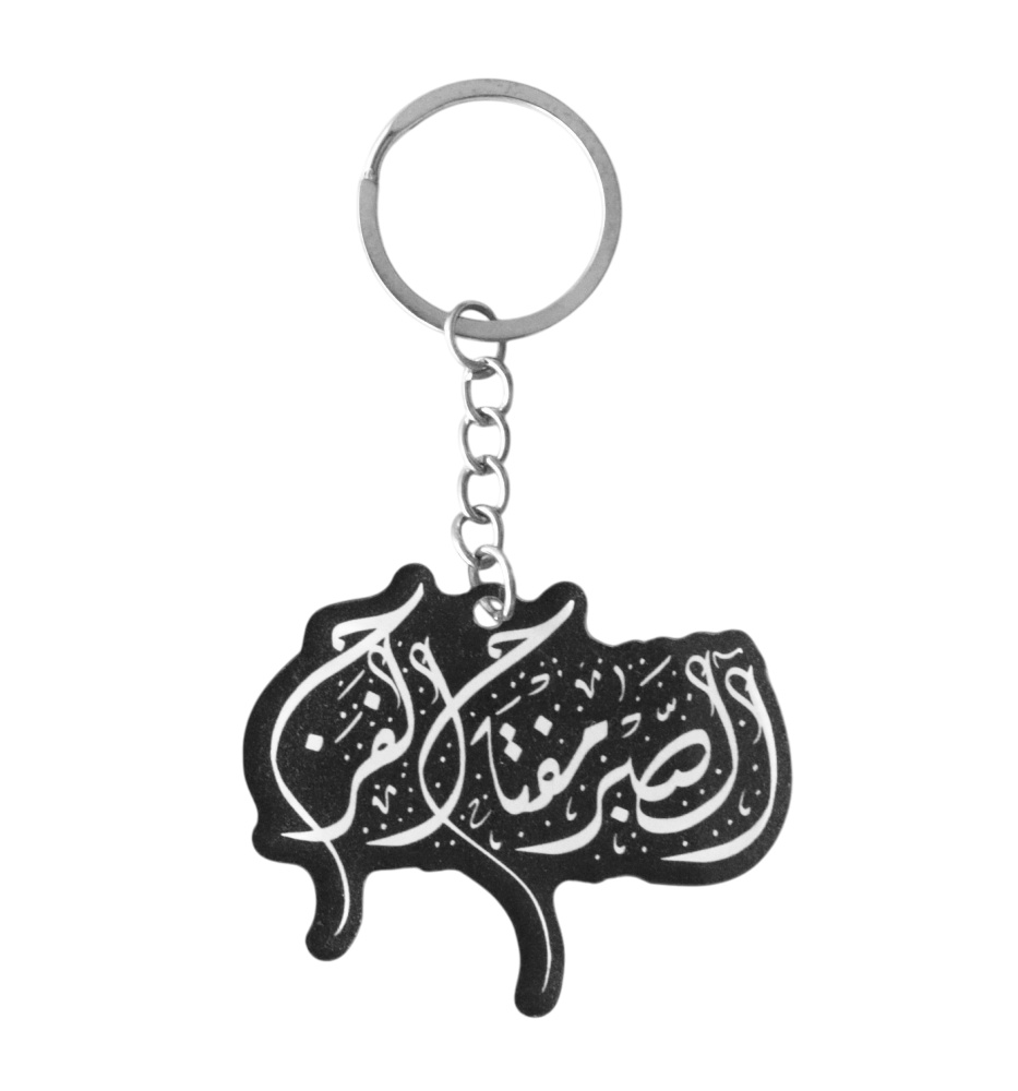 Porte clé très jolie calligraphie artistique du proverbe arabe "al-sabru miftâhu-l-faraj" الصبر مفتاح الفرج (La patience est la clé de la délivrance ou de la réussite). Ecrit en blanc sur fond noir.
