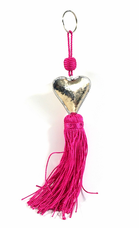 Porte-clés artisanal coeur en métal argenté ciselé et pompon en sabra - Fushia - REF. 29792 (6.90 €)