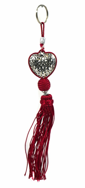 Porte-clés artisanal coeur en métal argenté ciselé et pompon en sabra - Rouge - REF. 29101 (6.90 €)