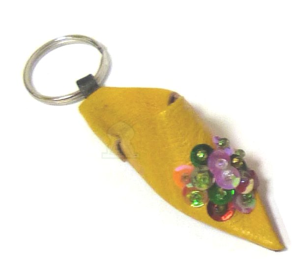Très beau porte-clés en forme de babouche marocaine, de fabrication artisanale, en cuir - composition cuir - couleur jaune, décorée de strasses en plusieurs couleurs...