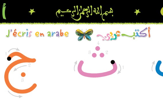 Poster "J'écris en arabe" sur lequel on peut s’entraîner à écrire avec un feutre effaçable. Chaque lettre est représentée avec le sens d'écriture. Chaque lettre du pourtour est accompagnée de l'image d'un mot arabe commençant par cette lettre.