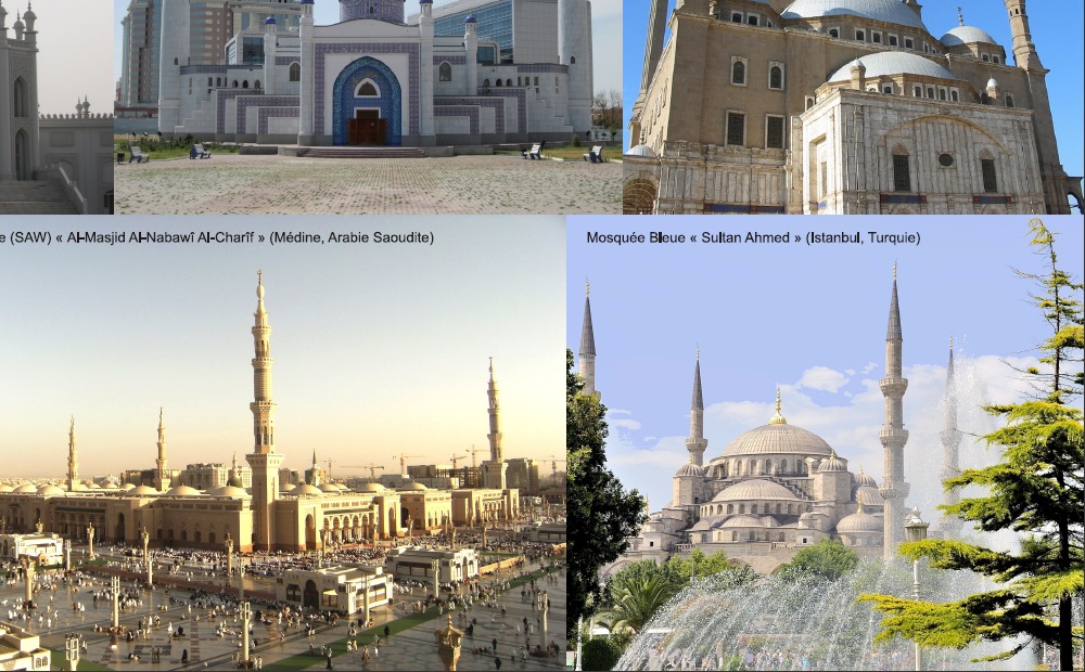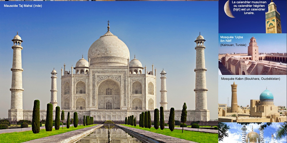 Poster regroupant les photos des mosquées et des monuments islamiques les plus célèbres à travers le monde... Aussi bien les anciens édifices que les plus récents.Un voyage à travers les siècles à la découverte de la civilisation arabo-musulmane et de ses architectures... Chaque photo possède une légende...Voici la liste des mosquées et monuments de haut en bas :