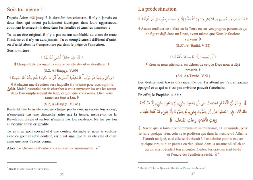 Ainsi, dans ce livre, les dires sont corroborés par des versets coraniques et des hadiths, dans leur majorité, authentiques.