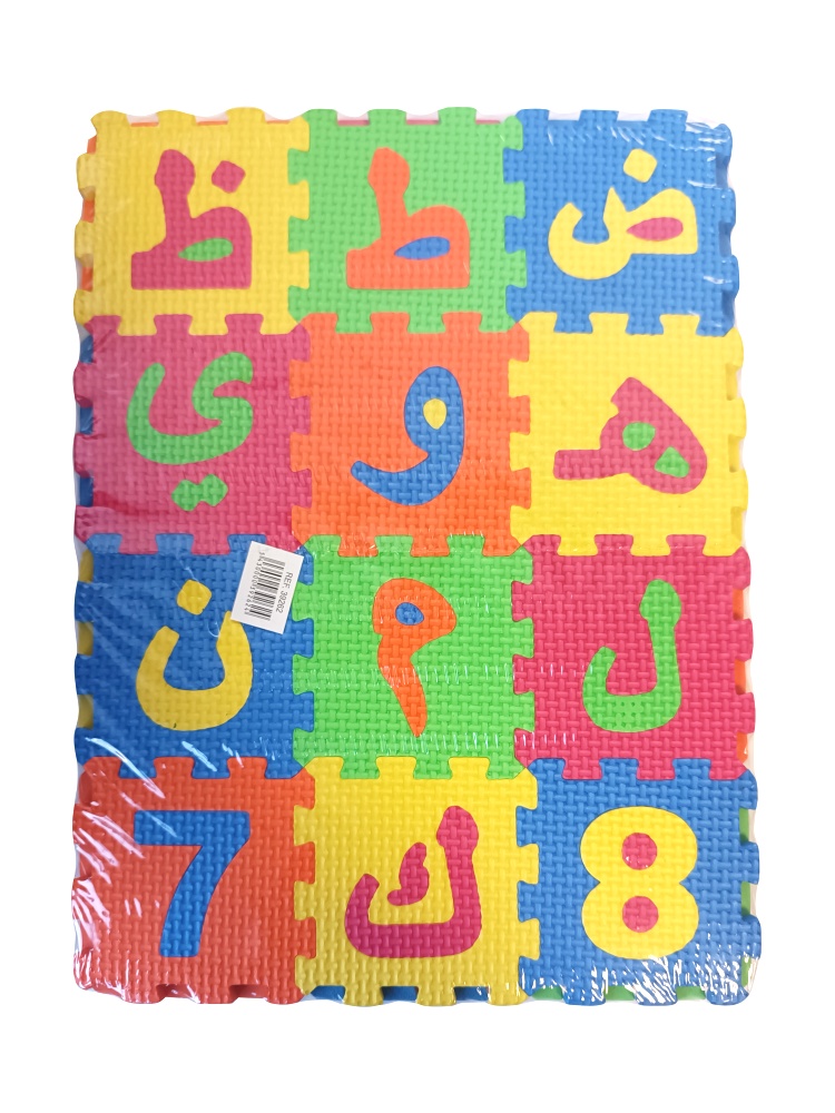 Contient 36 pièces de l'alphabet arabe et les chiffres. Chaque pièce fait 9 x 9 cm. Permet de constituer diverses formes ou un tapis rigide pour jouer dessus et un puzzle géant.